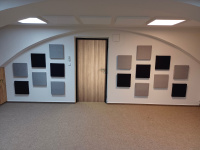 Na stěny jsme pak instalovali 30 kusů panelů Europa MINI, které se osvědčily jako účinné a zároveň vizuálně jemné a přitažlivé řešení. Jejich počet a rozmístění vycházelo z měření i z estetické dohody s vedením školy a stavební firmou - pro začátek jsme zvolili menší množství a ponechali si možnost v budoucnosti počet ještě navýšit. Z Pohledu závazné normy ČSN jsme již měli splněno a případné navýšení by již bylo jen vyhovění subjektivní potřebě v rámci tolerance normy.