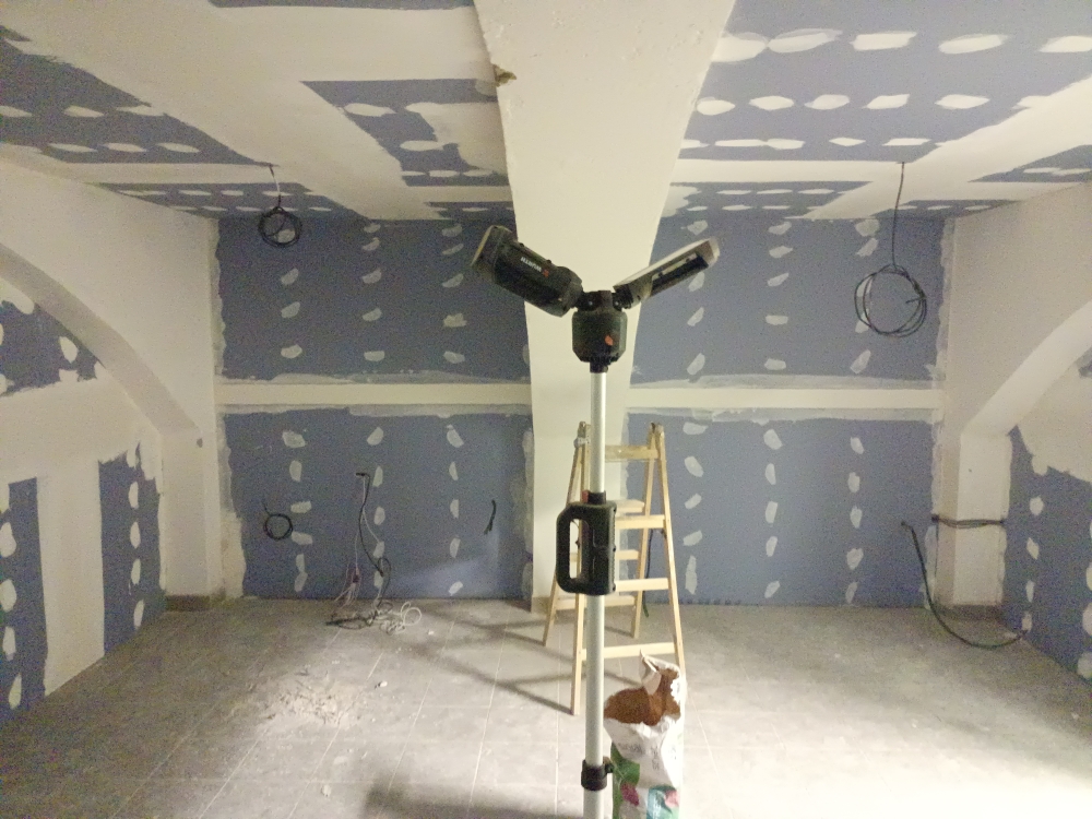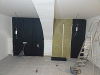 Nakonec bylo rozhodnuto - provést zdvojení stropu a třech z celkem čtyř obvodových stěn. Klenba byla překryta novou rovinou z SDK, odstranil se nevhodný molitan a zároveň vznikla čistá plocha vhodná pro budoucí akustické úpravy. Věděli jsme však, že jde o kompromis – v daných podmínkách však maximální možný.